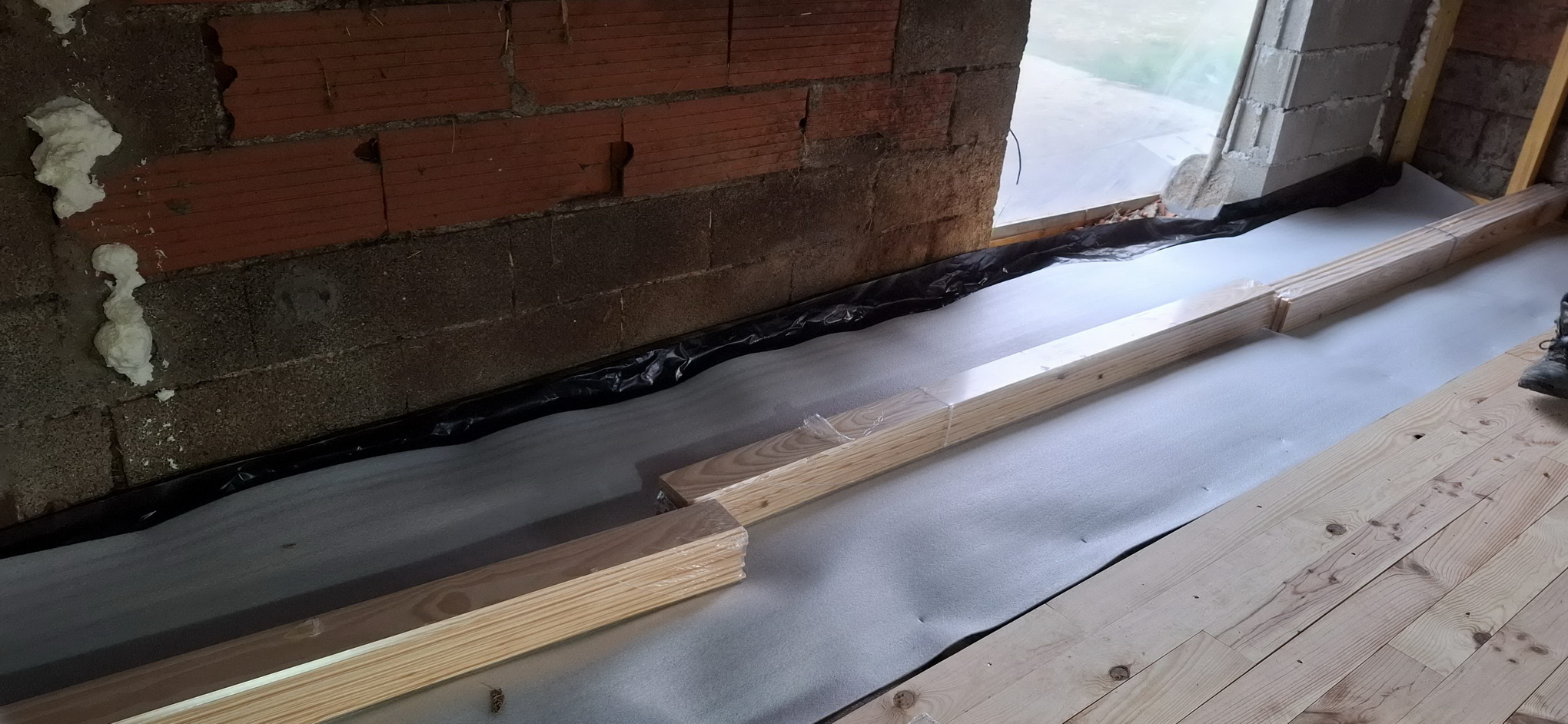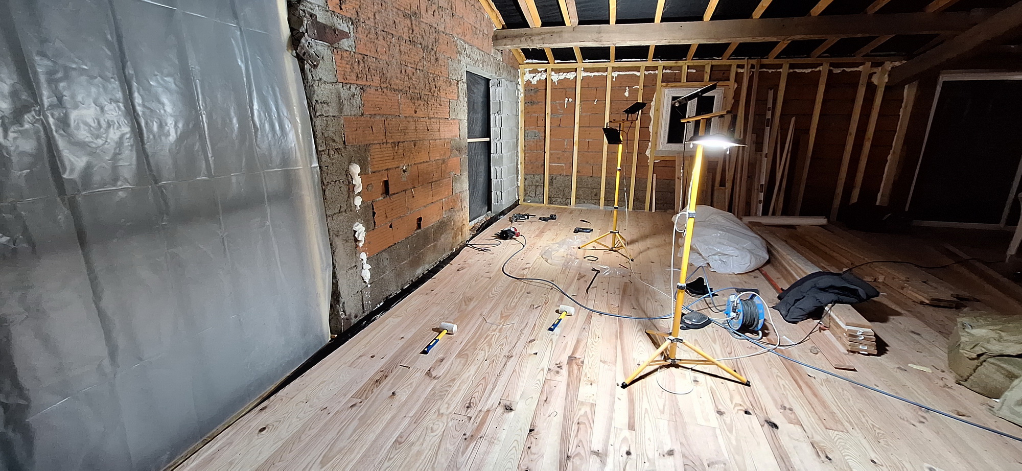 En wederom hebben we een mijlpaal bereikt. Zaterdagavond hebben we eindelijk de hele vloer afgemaakt en die ligt er nu volledig in. Wat een oppervlakte! Ik ben er die avond even een kwartiertje gaan zitten en kon me alleen maar verbazen en afvragen of het misschien toch niet te groot is. Niet iedereen zal een woonkamer/keuken hebben van 115 vierkante meter. Enorm maar vooral prachtig. Door de schuifpui heb je nu een uitzicht op de Pyreneeën. Fantastisch!