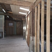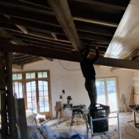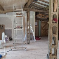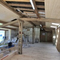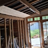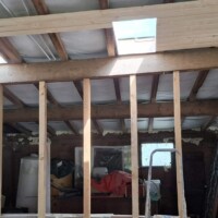 We hebben en mooie partij schroten op de kop kunnen tikken. Er was alleen wel een nadeel. Ze bleken 4,80 meter lang te zijn. Dat is echt onwerkbaar en dus besloten om ze te halveren. Dat heeft als nadeel dat de mes/groef verbindingen op de kop niet werken en je wat meer tijd nodig hebt om het mooi en goed in elkaar te zetten. Ditzelfde hadden we ook met de schroten op de zuidzijde. Voor het zicht maakt het eigenlijk weinig uit; je ziet er bijna niets van. Wel verandert het de binnenkant volledig. Het begint langzaam op een echt woongedeelte te lijken en wordt steeds lichter. Ik zal een foto er bij de doen van de binnenkant van de stal toen er nog koeien stonden. Wat een ongelooflijk verschil.