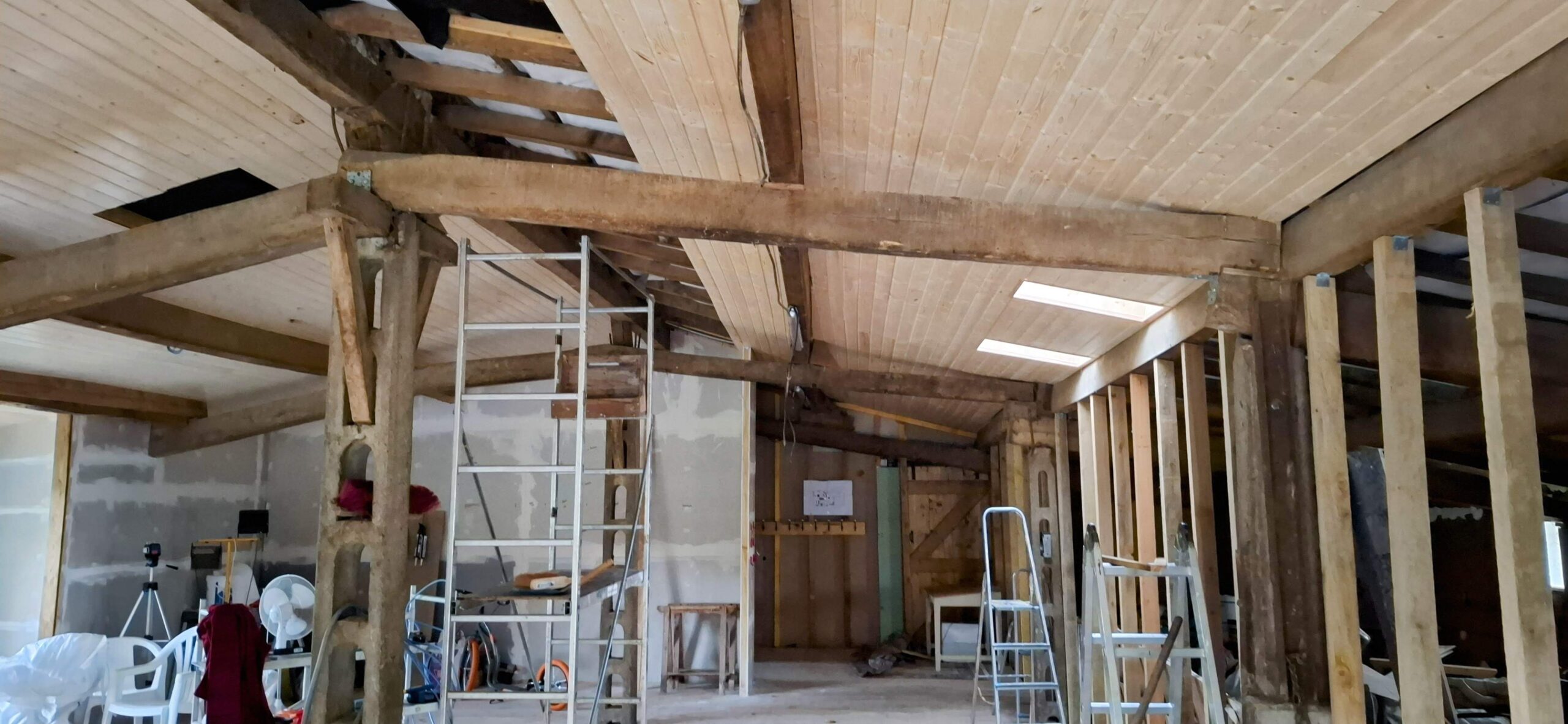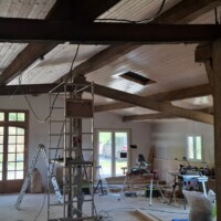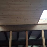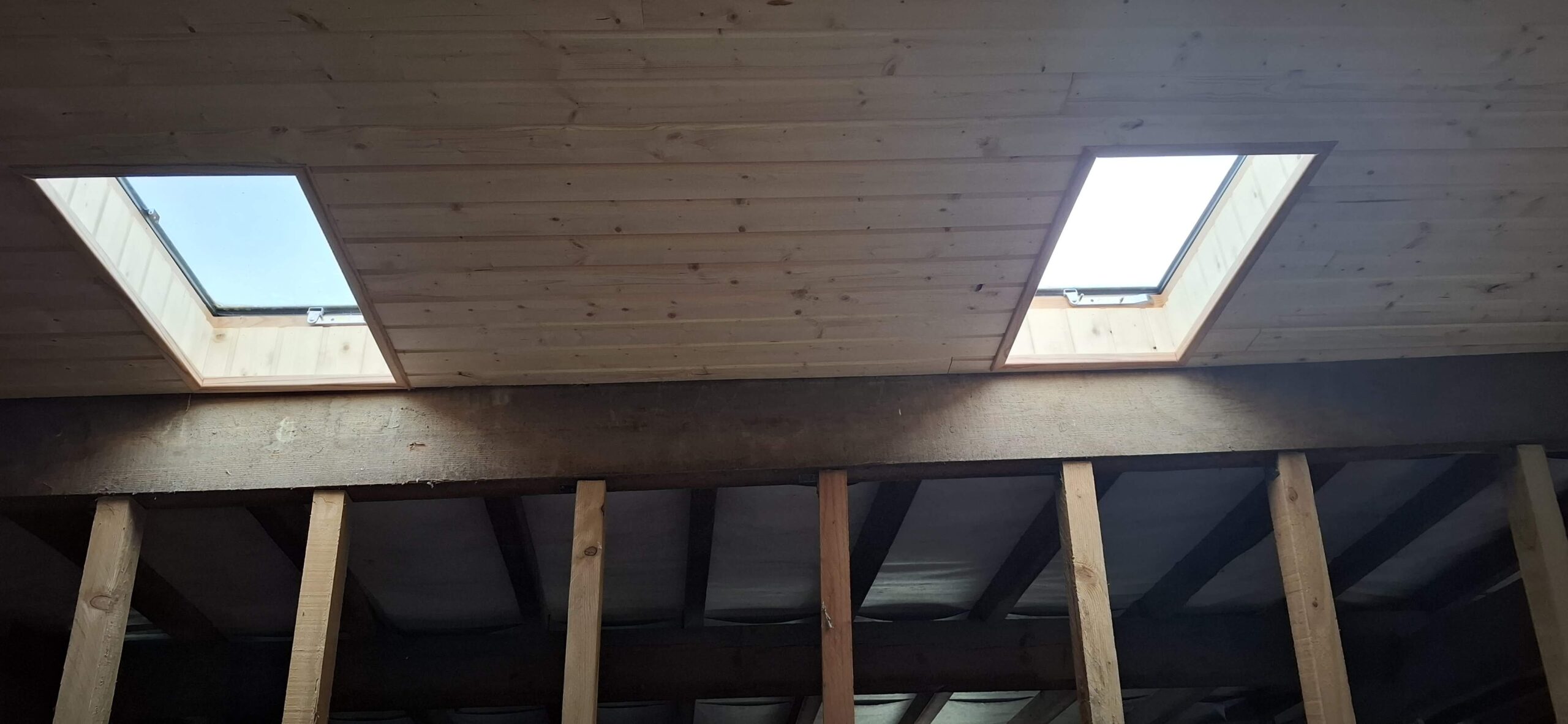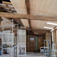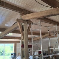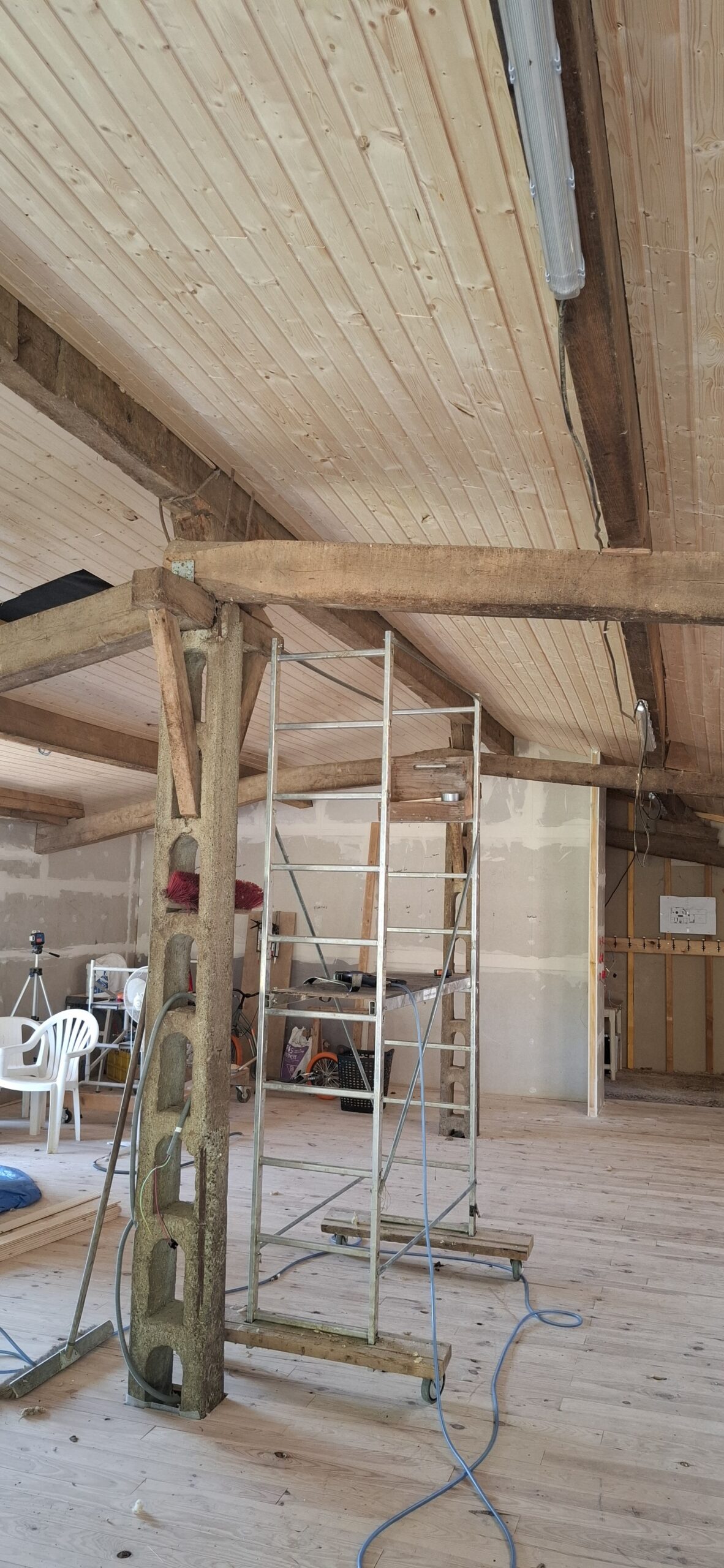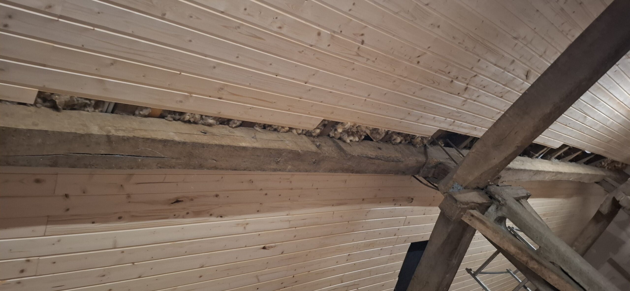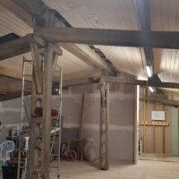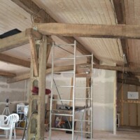 De afgelopen tijd hebben we eigenlijk alleen maar aan het plafond gewerkt. Omdat de grote balken zichtbaar blijven moet de lamrisering ertussen worden gemaakt. Dat gaat heerlijk snel met maar 1 nadeel. De balken liggen niet recht waardoor het begin en het einde van een vlak echt schrootje voor schrootje moet worden opgemeten. Daarnaast is het op het hoogste punt ook 3,5 meter hoog en kun je op het laatst maar per 2 schrootjes de wol er tussen stoppen omdat je er anders niet meer bij kunt.
