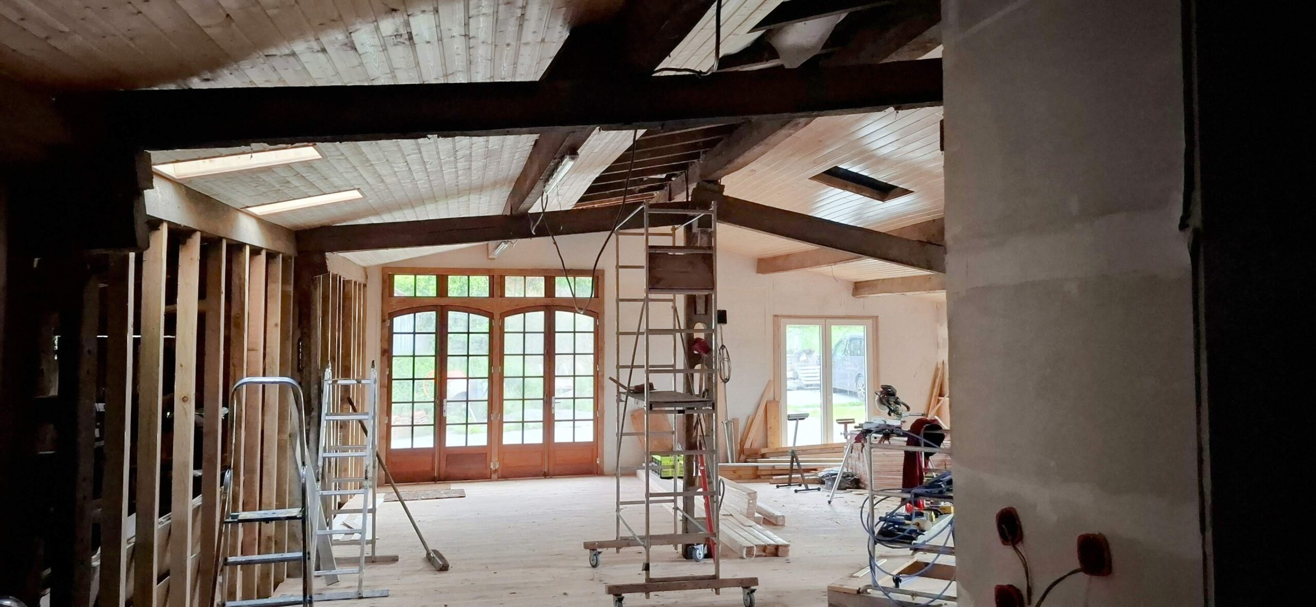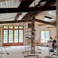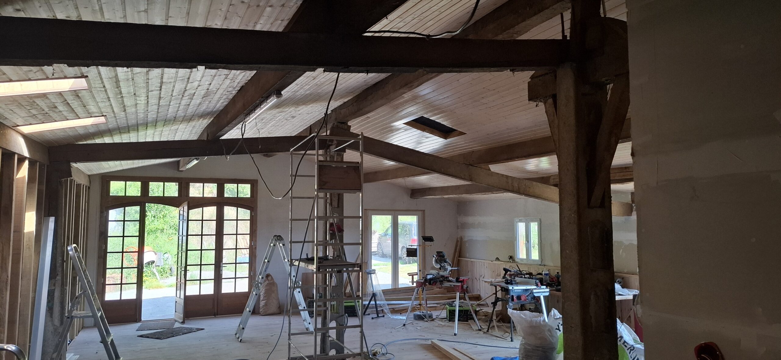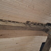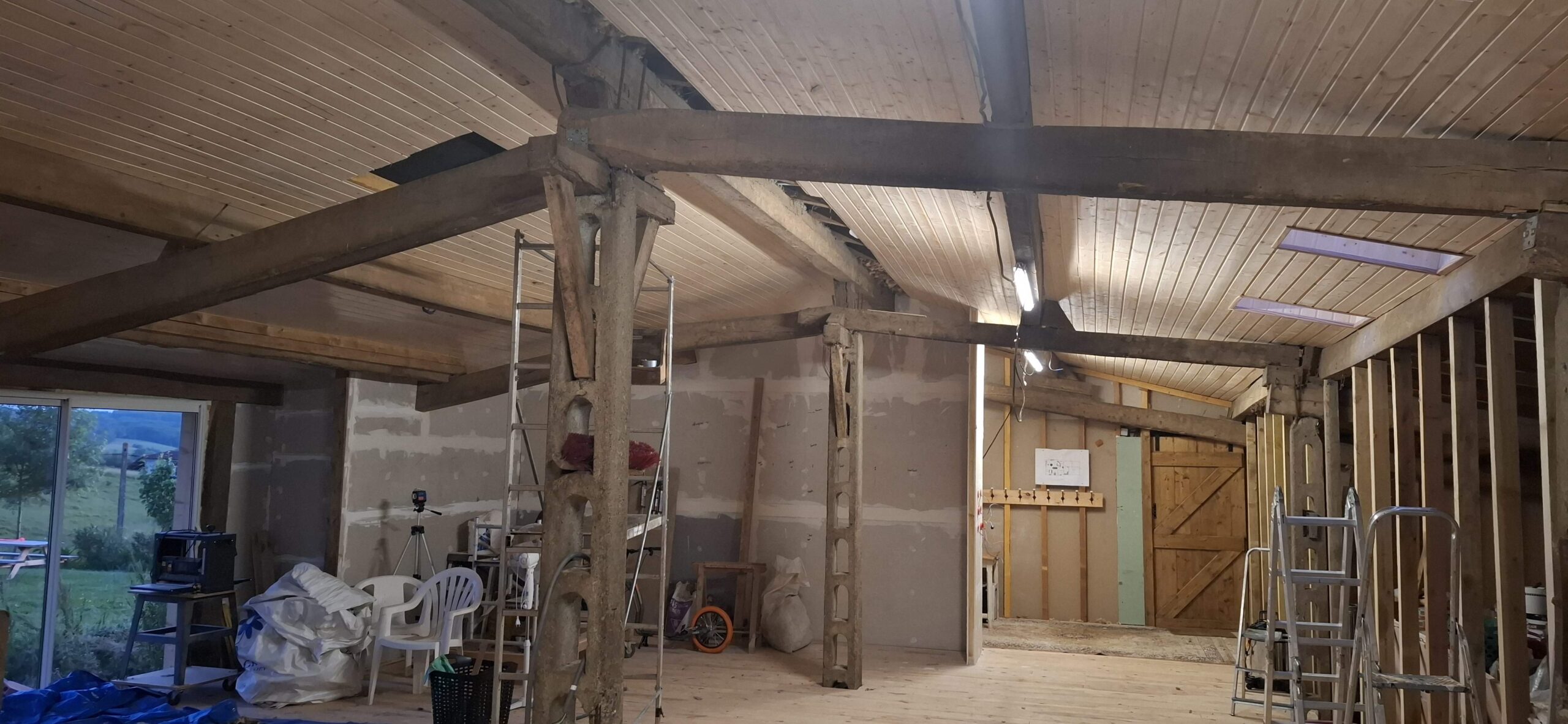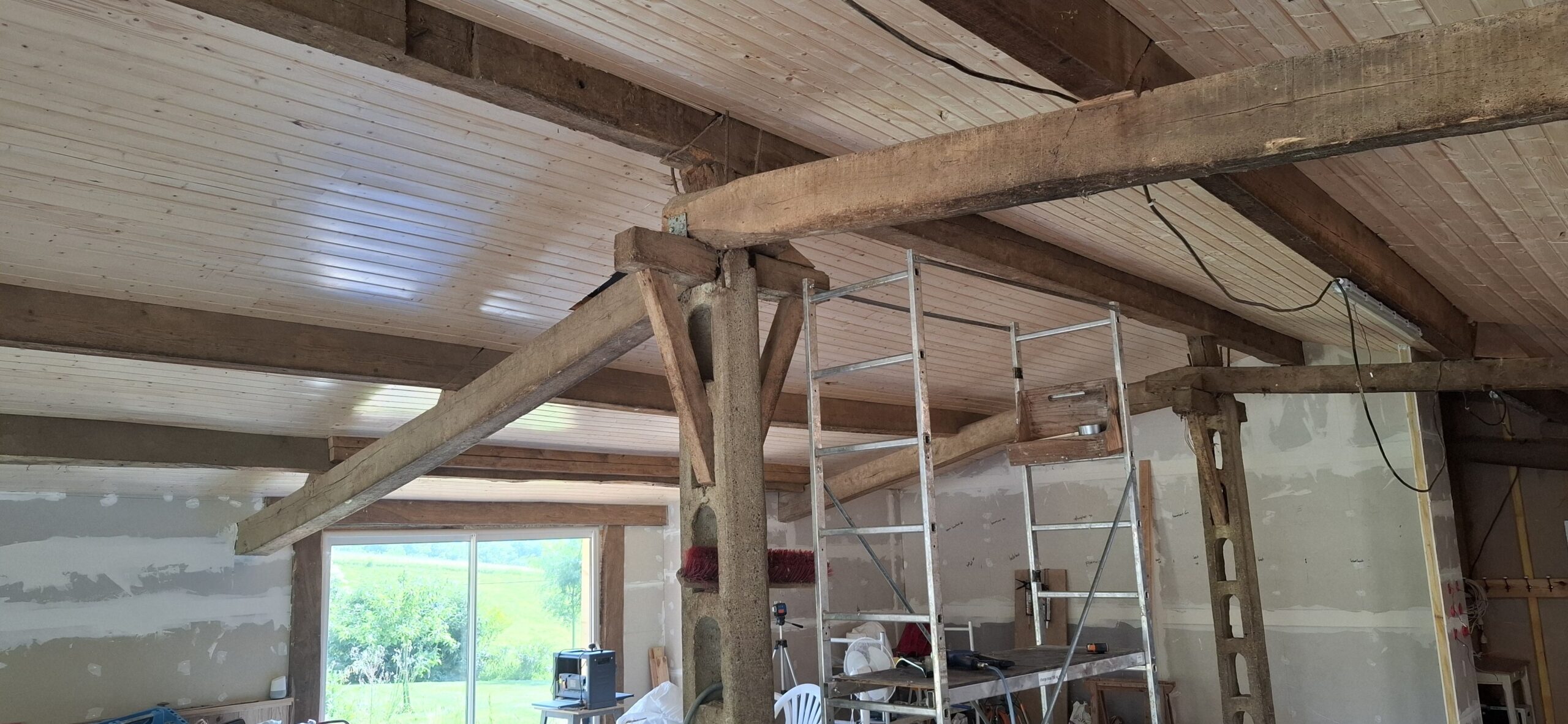 De afgelopen tijd hebben we eigenlijk alleen maar aan het plafond gewerkt. Omdat de grote balken zichtbaar blijven moet de lamrisering ertussen worden gemaakt. Dat gaat heerlijk snel met maar 1 nadeel. De balken liggen niet recht waardoor het begin en het einde van een vlak echt schrootje voor schrootje moet worden opgemeten. Daarnaast is het op het hoogste punt ook 3,5 meter hoog en kun je op het laatst maar per 2 schrootjes de wol er tussen stoppen omdat je er anders niet meer bij kunt.