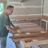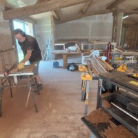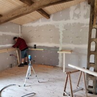 Goed, nadat het plafond klaar was (op de afwerklatten na), hebben we eerst de stal leeggeruimd. Dat gaf meteen een heel ander beeld: je begint nu echt te zien hoe de ruimte gaat worden. Daarna ben ik aan de slag gegaan met het schaven van de balken voor het frame van de nieuwe keuken. We gaan namelijk de keuken uit het kleine huisje overzetten naar de stal. Het frame maken we zo dat de kastjes er straks precies in passen. Dus eerst alle balken netjes terugschaven naar 7 bij 5,5 cm. Later schilderen we die zwart, zodat ze mooi matchen met de zwarte kastdeurtjes.