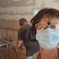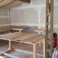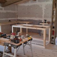 Na een dikke week zagen en schaven is het werkeiland af en het grootste deel van het aanrechtblad ook. Ondertussen ligt de hele stal onder een dikke laag stof, maar dat mag de pret niet drukken. Het idee dat we hiermee flink wat geld besparen én hout gebruiken dat anders op de brandstapel zou belanden, geeft echt een goed gevoel.