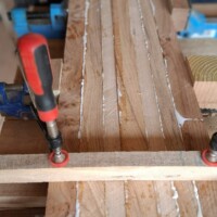 De eerste stroken zijn inmiddels gelijmd en staan te drogen. Ik maak er weer planken van die net iets breder zijn dan 21 cm, zodat ze door mijn schaafmachine passen. Mocht dat niet lukken, dan heb ik gelukkig vrienden met échte machines en klemmen. Maar goed, dat is natuurlijk mijn eer te na — ik wil het eerst zelf proberen!