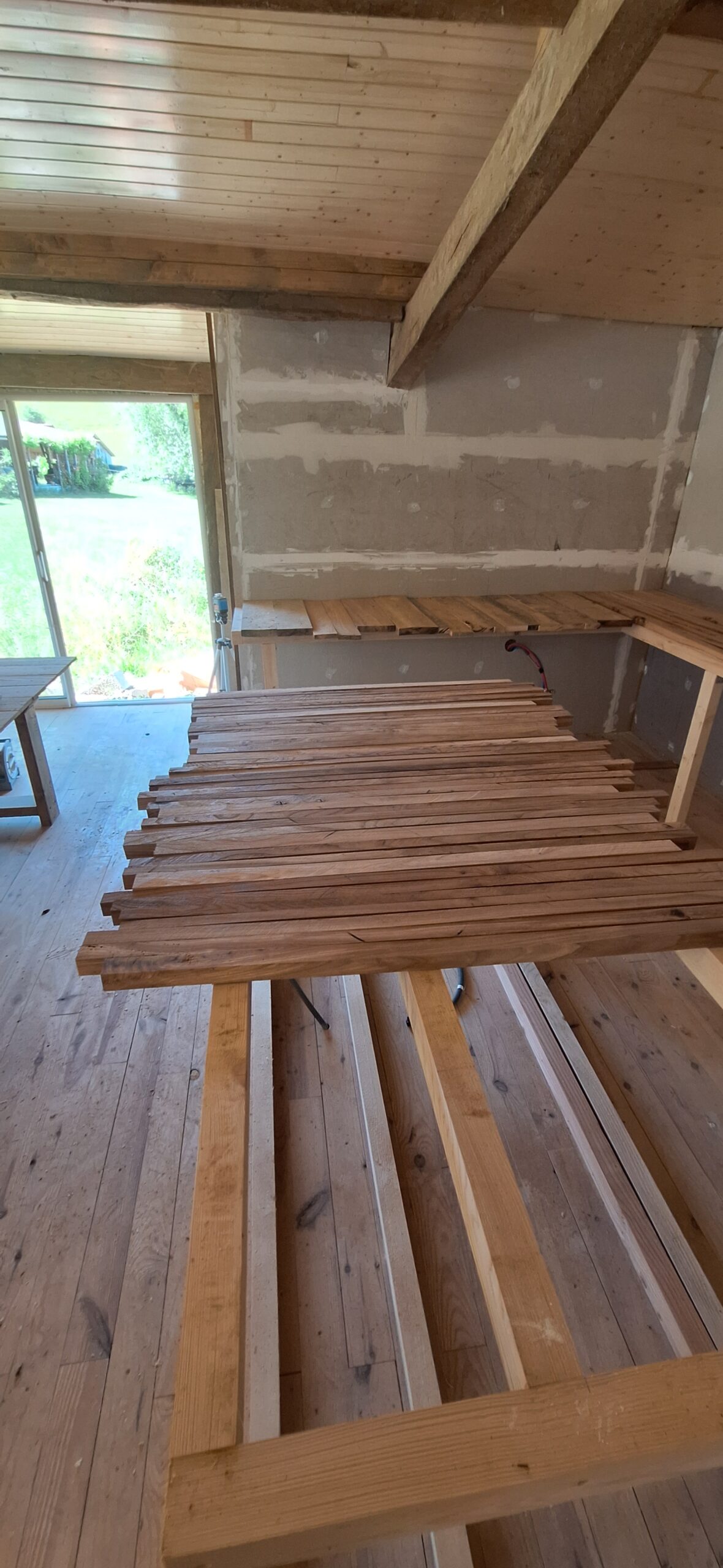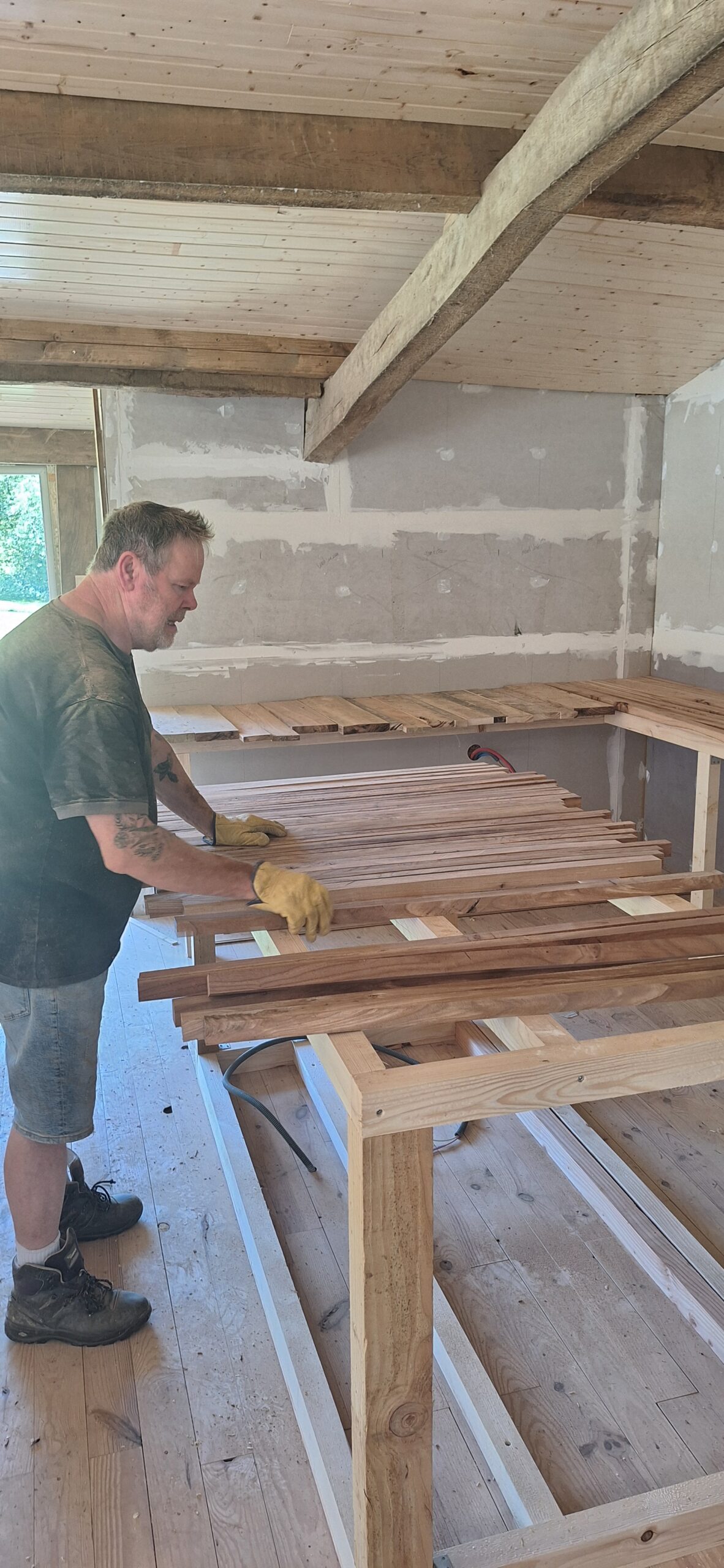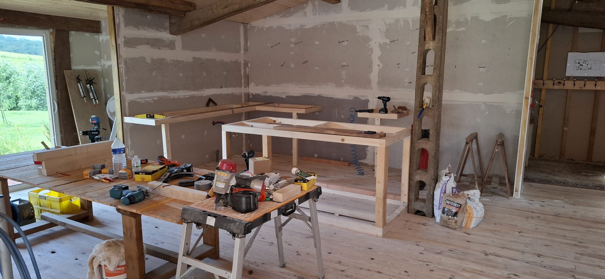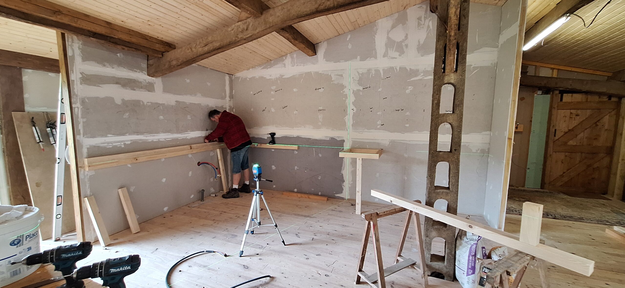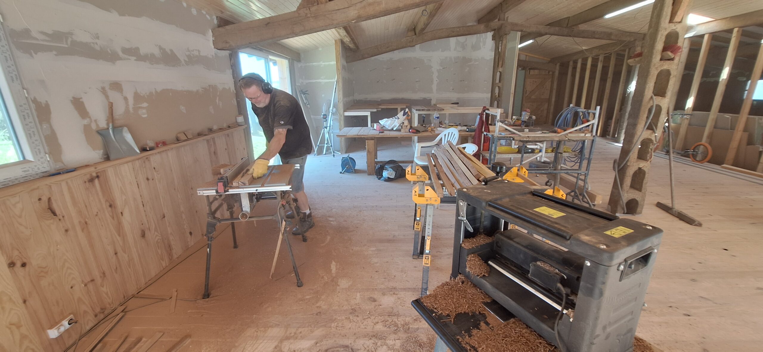 Goed, nadat het plafond klaar was (op de afwerklatten na), hebben we eerst de stal leeggeruimd. Dat gaf meteen een heel ander beeld: je begint nu echt te zien hoe de ruimte gaat worden. Daarna ben ik aan de slag gegaan met het schaven van de balken voor het frame van de nieuwe keuken. We gaan namelijk de keuken uit het kleine huisje overzetten naar de stal. Het frame maken we zo dat de kastjes er straks precies in passen. Dus eerst alle balken netjes terugschaven naar 7 bij 5,5 cm. Later schilderen we die zwart, zodat ze mooi matchen met de zwarte kastdeurtjes.