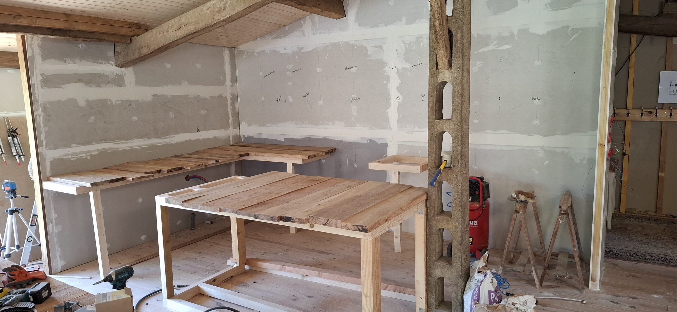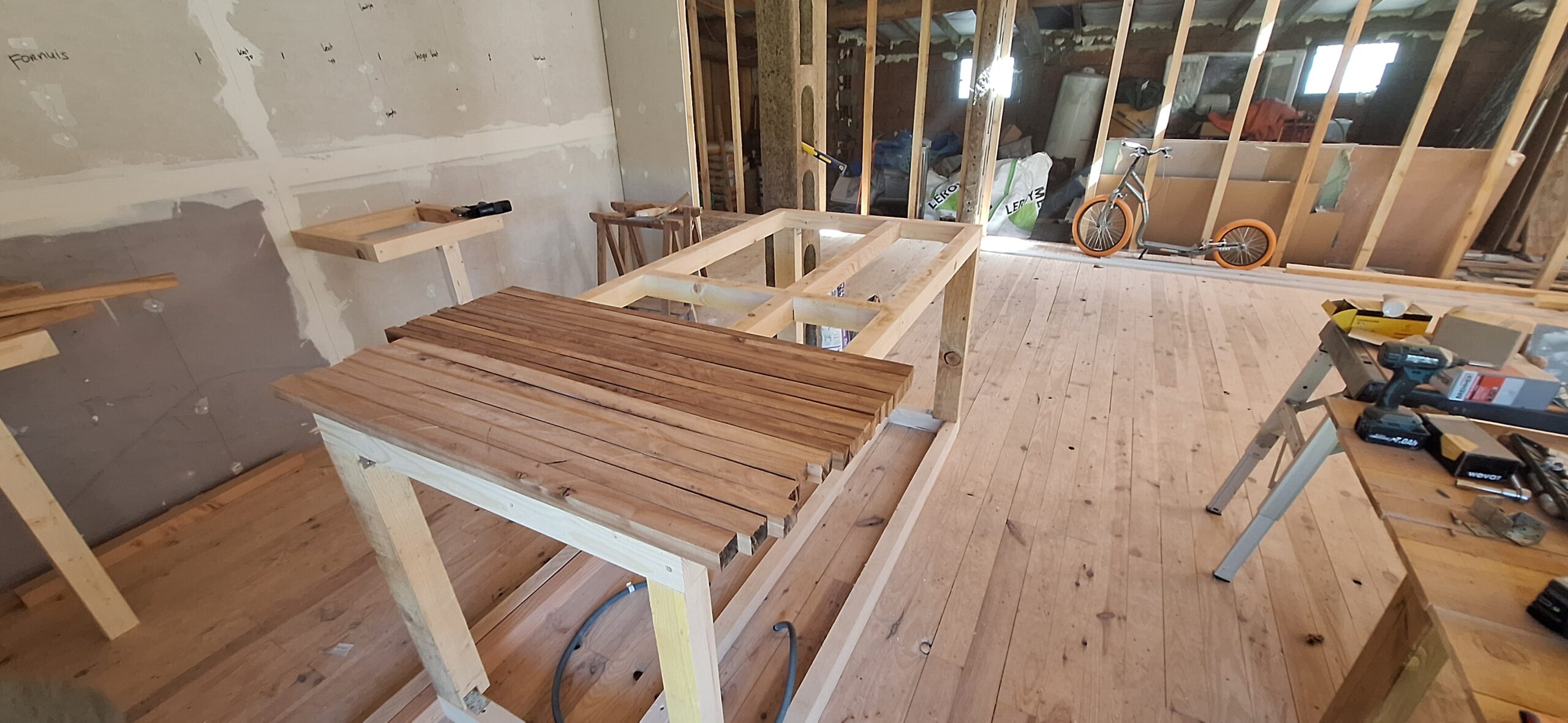 Na een dikke week zagen en schaven is het werkeiland af en het grootste deel van het aanrechtblad ook. Ondertussen ligt de hele stal onder een dikke laag stof, maar dat mag de pret niet drukken. Het idee dat we hiermee flink wat geld besparen én hout gebruiken dat anders op de brandstapel zou belanden, geeft echt een goed gevoel.