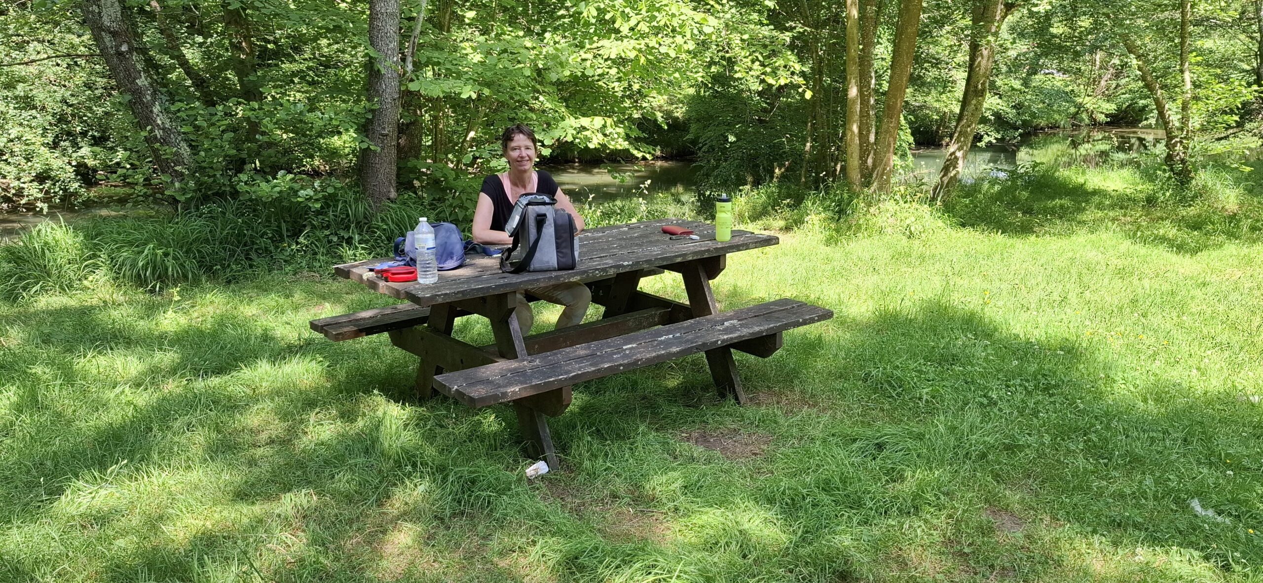 Afgelopen week ontsnapten er trouwens ook nog twee ezels. Gelukkig waren ze niet ver weggelopen, maar bij het terughalen is Dorine gevallen en op haar knie terechtgekomen. Resultaat: een dikke, gezwollen knie vol vocht. Dus dat betekent rust… NATUURLIJK… voor wie Dorine kent: rust, ja ja! Ze kon zaterdag in elk geval niet mee fietsen, dus besloot ik het rondje alleen te doen. Dorine zou gewoon mee gaan (rustig aan, natuurlijk) en dan zouden we samen na afloop bij een leuk picknickbankje aan het water een kopje koffie drinken en een croissantje eten. Ben ik bijna bij dat bankje — nog zo’n 3 km te gaan — wie kom ik daar tegen? Juist, Dorine met Amai, die een stukje waren gaan lopen. Uiteraard, rustig aan doen. 😉