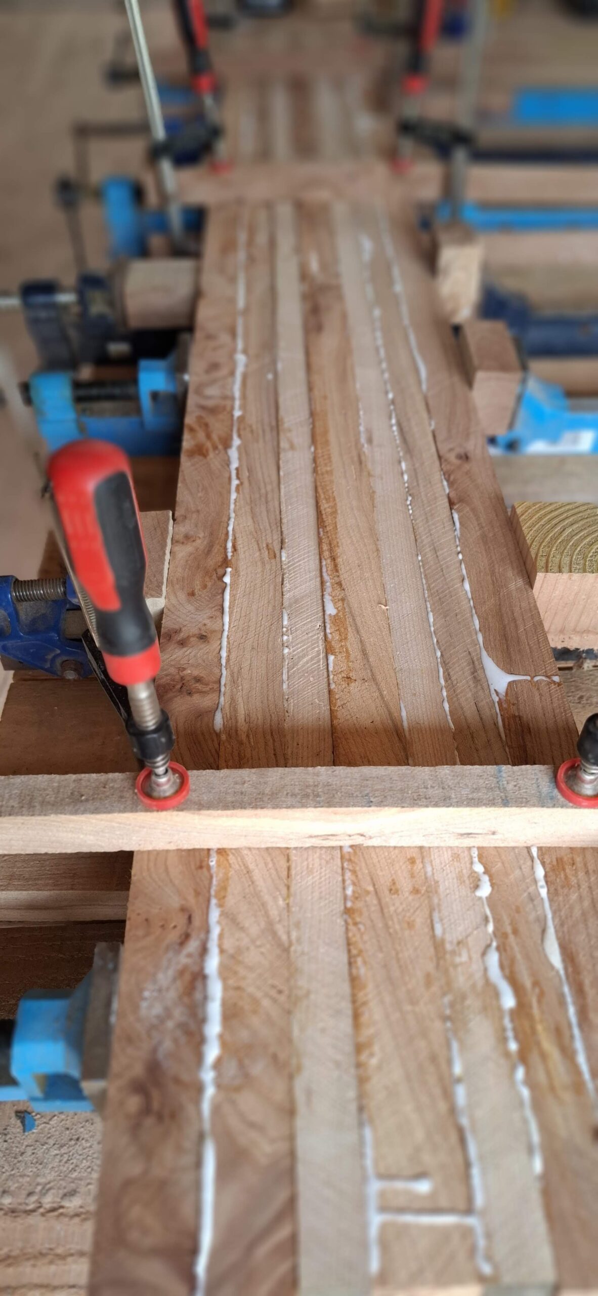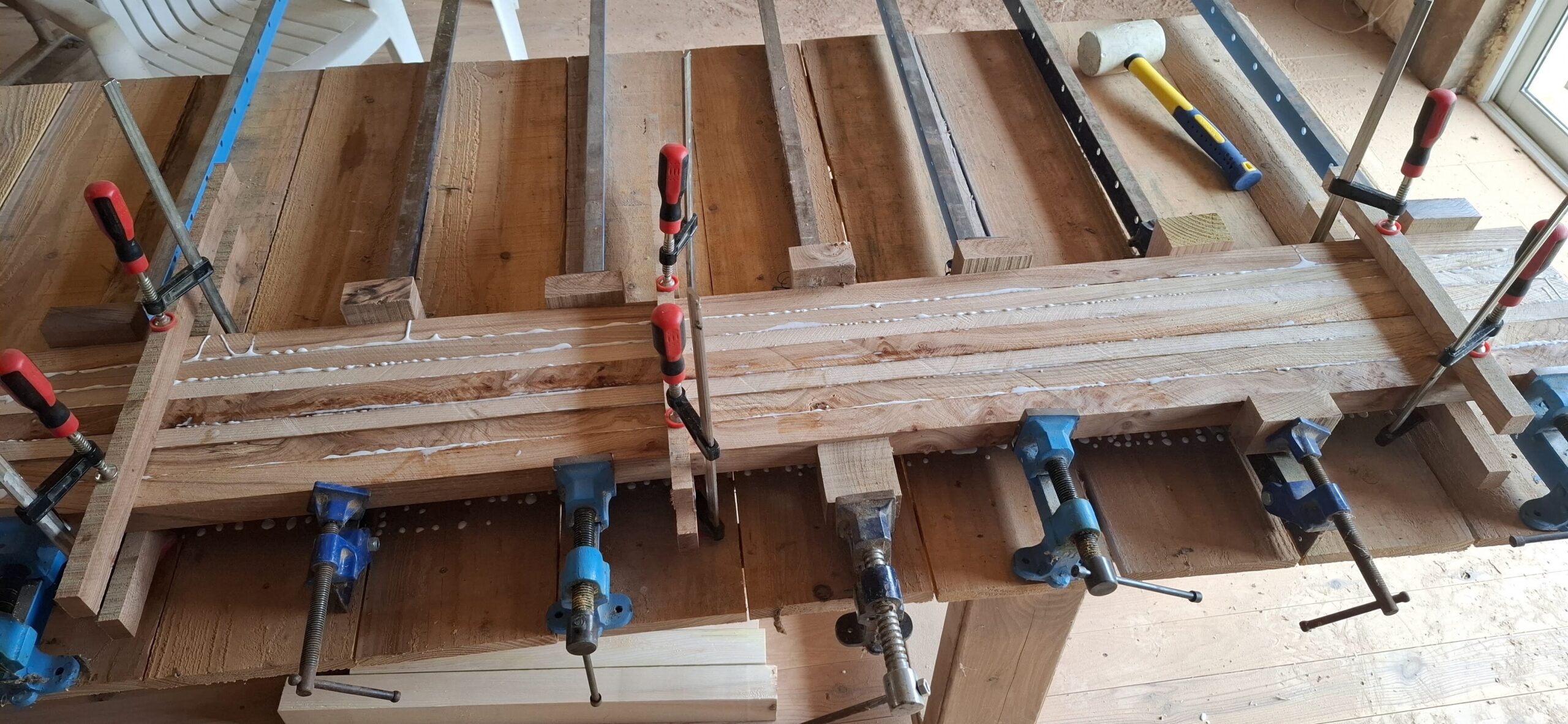 De eerste stroken zijn inmiddels gelijmd en staan te drogen. Ik maak er weer planken van die net iets breder zijn dan 21 cm, zodat ze door mijn schaafmachine passen. Mocht dat niet lukken, dan heb ik gelukkig vrienden met échte machines en klemmen. Maar goed, dat is natuurlijk mijn eer te na — ik wil het eerst zelf proberen!