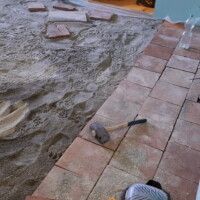 Als ik het hier overnieuw zou moeten/mogen doen, dan komt er over de zandlaag nu een gewapende cementlaag, mooi waterpas of in de badk juist niet, maar naar het putje en dan de tomettes of in het natte cement leggen of erop lijmen. Dan kun je ze wel zonder voegnaad leggen.