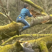 Het blijft een enorme drukte met de afwisseling van werken, experimenteren en een lekkend dak. Ik vind het meest stoere, als ik Dorien geklemd op een boom met een kettingzaag zie stoeien. Hulde!