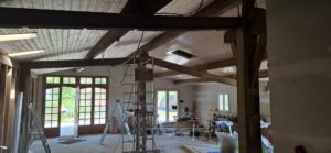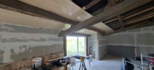 De afgelopen tijd hebben we eigenlijk alleen maar aan het plafond gewerkt. Omdat de grote balken zichtbaar blijven moet de lamrisering ertussen worden gemaakt. Dat gaat heerlijk snel met maar ...
